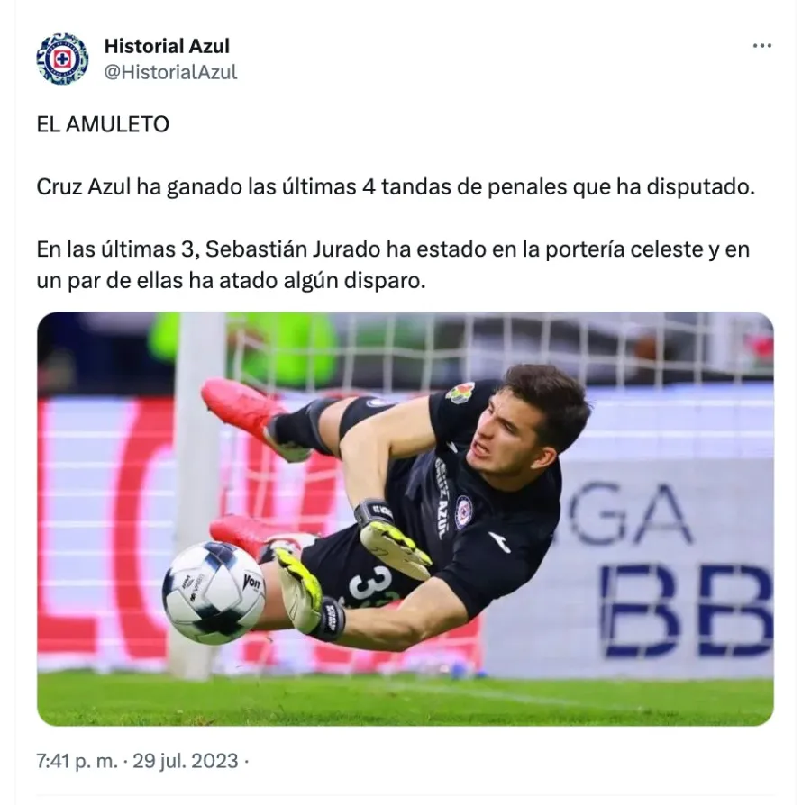 “El amuleto. Cruz Azul ha ganado las últimas cuatro tandas de penales que ha disputado. En las últimas tres, Sebastián Jurado ha estado en la portería celeste y en un par de ellas ha atado algún disparo”, se apunta desde la cuenta Historial Azul.