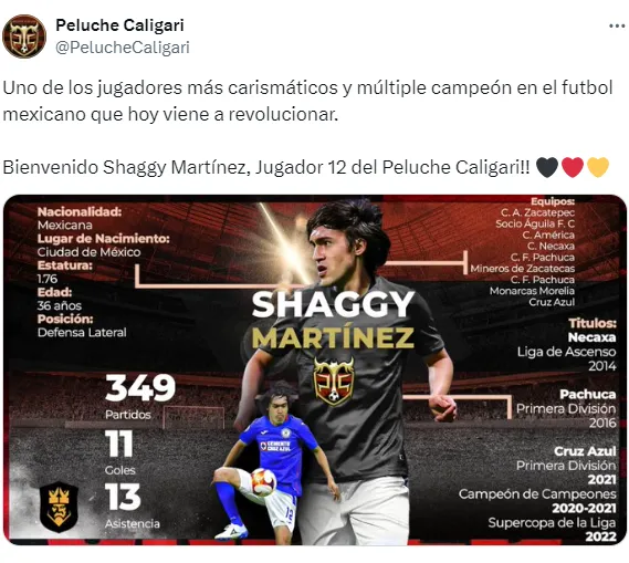 “Uno de los jugadores más carismáticos y múltiple campeón en el futbol mexicano que hoy viene a revolucionar. Bienvenido Shaggy Martínez, Jugador 12 del Peluche Caligari“, fue el mensaje con el que el equipo del Escorpión Dorado y su hermano Werevertumorro.