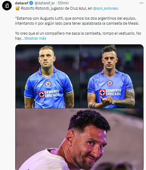 “Estamos con Augusto Lotti, que somos los dos argentinos del equipo, intentando ir por algún lado para tener apalabrada la camiseta de Messi. Yo creo que si un compañero me saca la camiseta, rompo el vestuario. No hay vuelta atrás”, reveló y bromeó el extremo de Cruz Azul en una entrevista con el programa de streaming argentino Son Aviones.