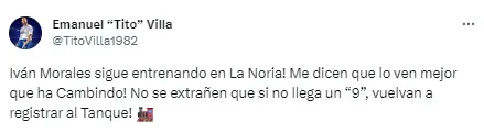 “Iván Morales sigue entrenando en La Noria. Me dicen que lo ven mejor que a Cambindo. No se extrañen que si no llega un “9”, vuelvan a registrar al Tanque“, insistió el Tito Villa, exgoleador de La Máquina.