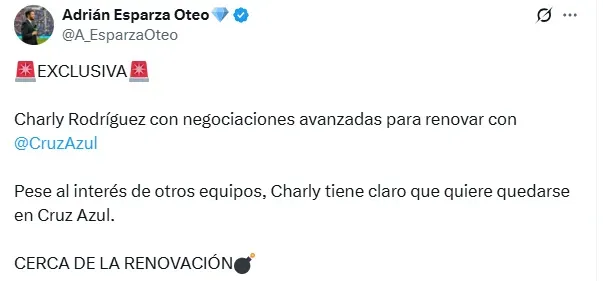 Caso similar para Charly Rodríguez, otro que termina contrato este verano y del que se ha hablado mucho en las últimas semanas. “Charly Rodríguez con negociaciones avanzadas para renovar con Cruz Azul”, aseguró la misma fuente por la misma vía.