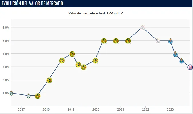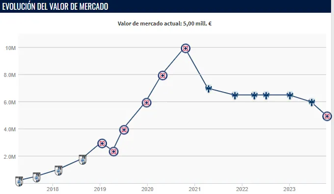 Por su parte, Jorge Sánchez perdió 500 mil euros en su precio de mercado luego de que pasara del Porto a La Máquina Cementera. Mientras que en junio se le otorgaba un valor de 3.5 millones de euros, ahora el mismo se ubica en 3 millones.