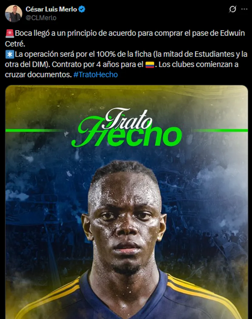 Según informó el periodista especializado César Luis Merlo, existe ya un principio de acuerdo para que el colombiano sea nuevo refuerzo del Xeneize. La operación se habría cerrado bajo la modalidad de “Trato Hecho”, involucrando la compra del 100% del pase del jugador, repartido entre Estudiantes y el DIM.