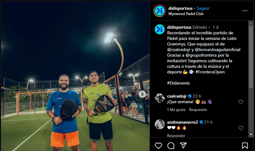 Se trata nada menos que de pádel, una disciplina que viene creciendo a pasos agigantados. “Recordando el increíble partido de Pádel para iniciar la semana de Latin Grammys. Que equipazo el de Carlos Salcedo y Leonardo Aguilar (líder del Grupo Frontera)”, expresaron a través de Didi Sports en su Instagram.