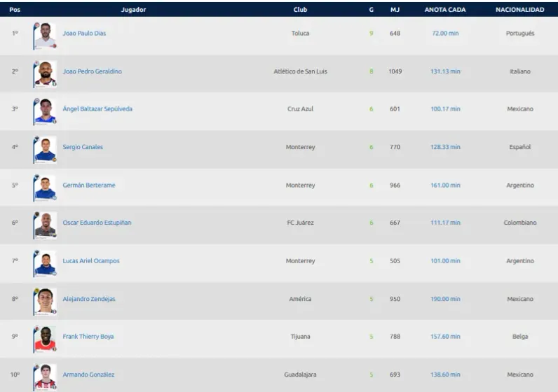 Ángel Sepúlveda se mantiene en la pelea del goleo del Apertura 2025 con 6 tantos en 601 minutos disputados con Cruz Azul. Actualmente ocupa el tercer lugar de la tabla, solo detrás de Joao Paulo Dias de Toluca (9) y Joao Pedro Geraldino de Atlético de San Luis (8).