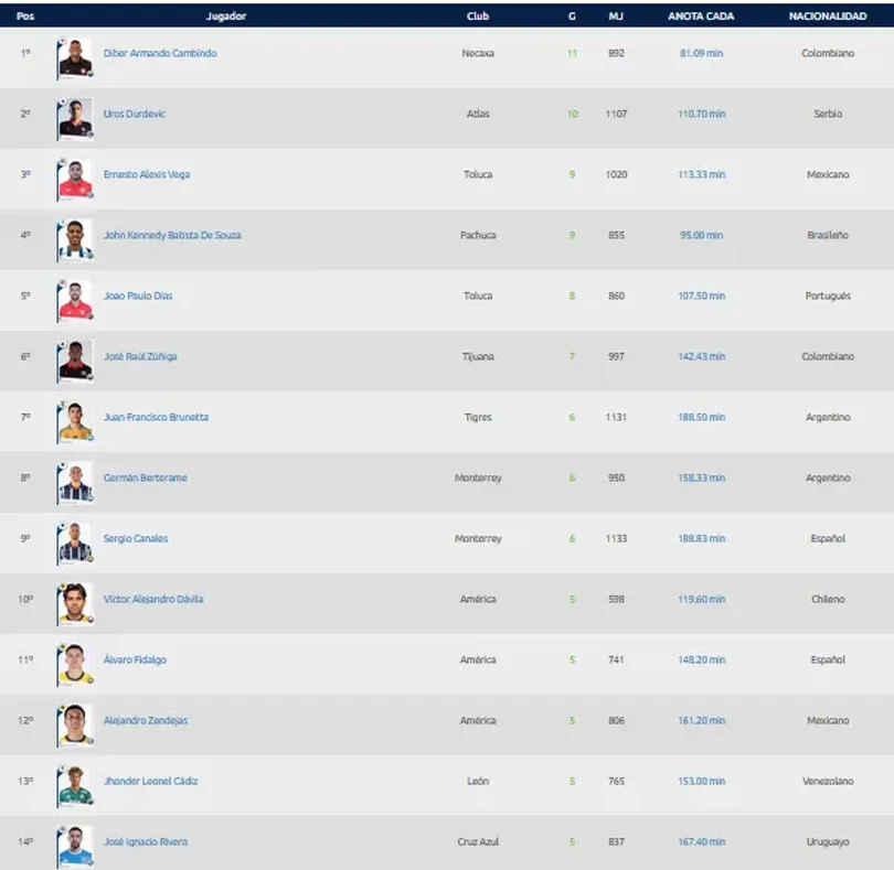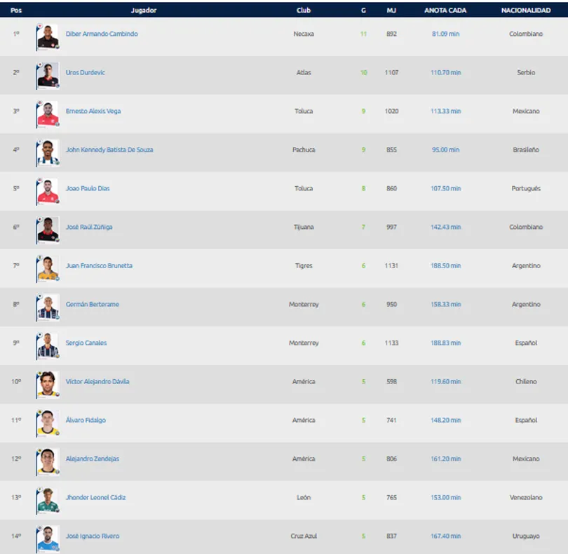 El ex jugador de Defensa y Justicia llegó a los 5 tantos en la Liga MX actual, alcanzando el 14° lugar de la tabla, el cual comparte con otros cuatro jugadores por lo que virtualmente está entre los primeros 10. De todos modos está lejos de los 11 de Diber Cambindo, pero no deja de ser meritorio por su posición.