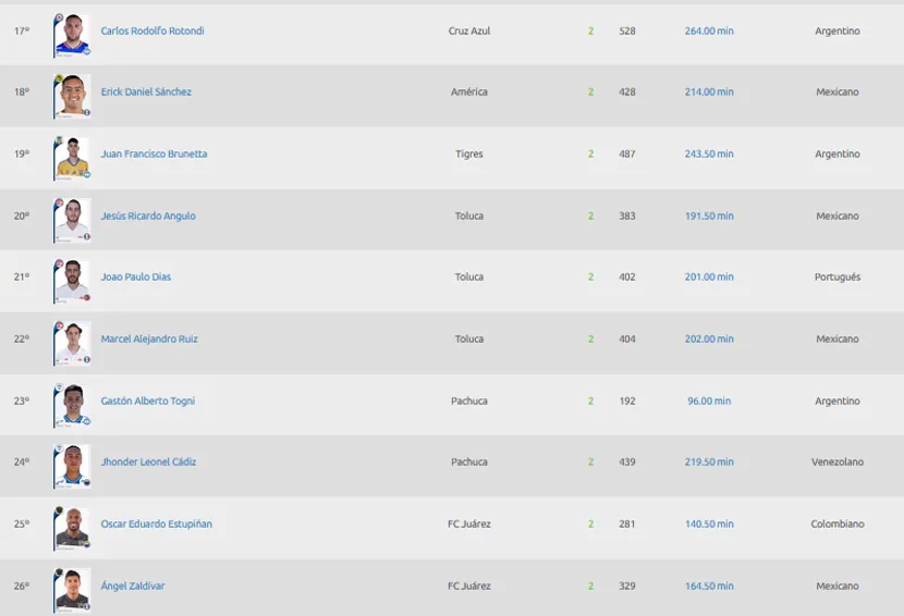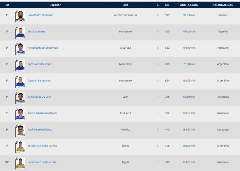 Entre los primeros puestos de la tabla de goleo no aparece el carrilero zurdo, quien registra dos conquistas en los seis partidos que le ha tocado disputar. El máximo artillero hasta ahora es Joao Pedro, quien con Atlético San Luis tiene 6 dianas. Le sigue Ángel Sepúlveda con 5, y un cementero que se cuela en el top es Charly Rodríguez, con 3.