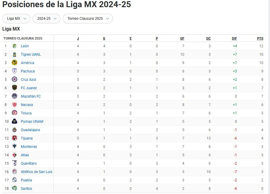 Tabla de posiciones del Clausura 2025 AL MOMENTO