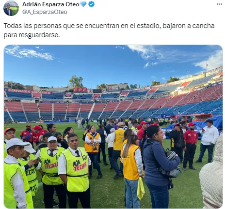 Desde dentro del inmueble, el periodista Adrián Esparza Oteo compartió videos de la situación, y exhibió cómo las personas que se encontraban en las gradas bajaron rápidamente al campo del juego para encontrar seguridad.