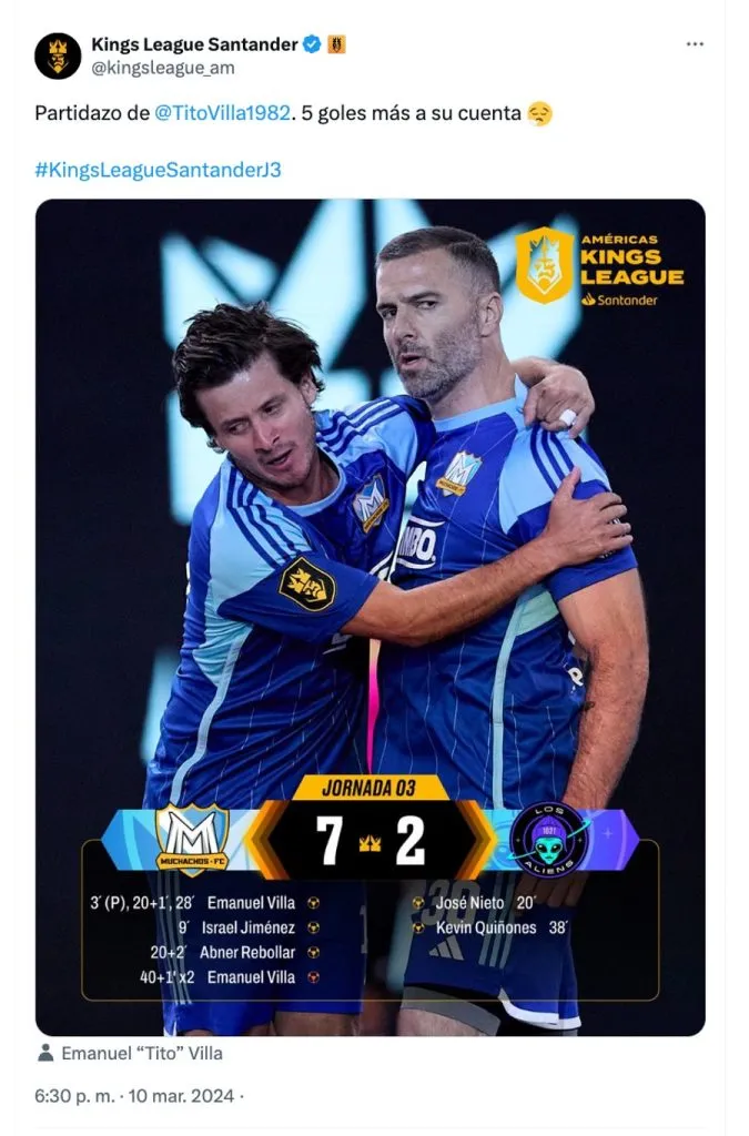 Emanuel Villa se despachó con una soberbia actuación en la tercera jornada de la Kings League Américas. Este domingo, ¡el Tito marcó cinco goles! Manita del histórico goleador de Cruz Azul en la contundente victoria (7-2) que consiguió Muchachos FC sobre Aliens FC.