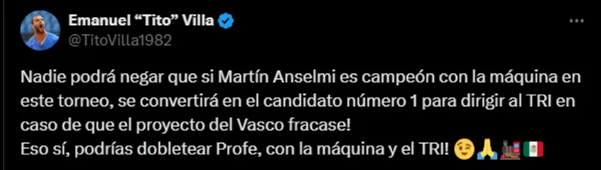 Entre todos ellos aparece nada menos que Emanuel Villa, quien desde su rol de ídolo cementero pero con su ya pulido ojo de periodista, se animó a proponer a su compatriota para la banca mexicana. Lo dejó en claro en su cuenta personal de X (ex Twitter), aunque haciendo una importante salvedad al respecto.