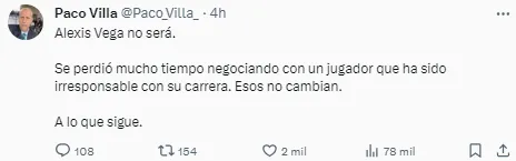 Paco Villa no se quedó atrás y tildó de “irresponsable” al atacante del Guadalajara: “Alexis Vega no será. Se perdió mucho tiempo negociando con un jugador que ha sido irresponsable con su carrera. Esos no cambian. A lo que sigue”.