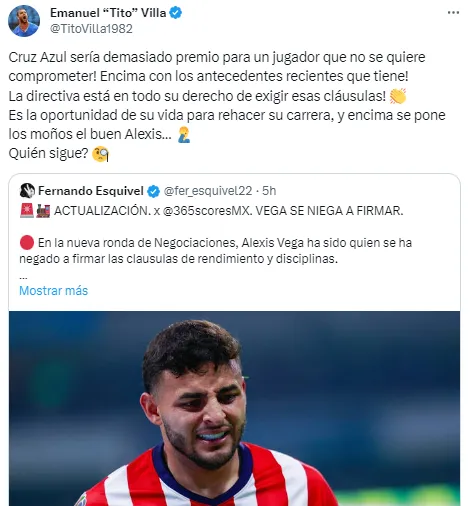“Cruz Azul sería demasiado premio para un jugador que no se quiere comprometer! Encima con los antecedentes recientes que tiene! La directiva está en todo su derecho de exigir esas cláusulas! Es la oportunidad de su vida para rehacer su carrera, y encima se pone los moños el buen Alexis… Quién sigue?”, escribió el ahora analista deportivo.