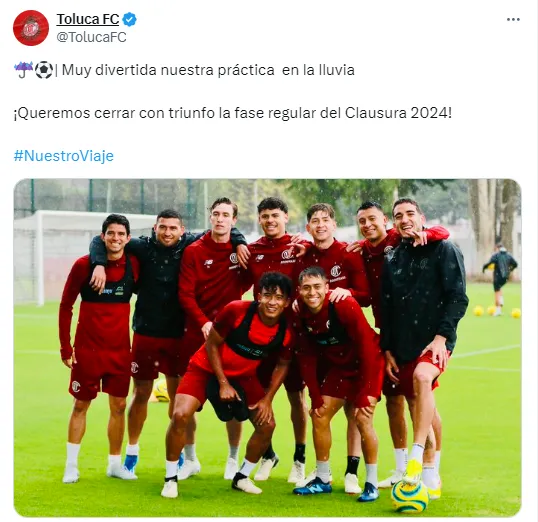 “¡Queremos cerrar con triunfo la fase regular del Clausura 2024!”, lanzó el conjunto mexiquense, a través de su cuenta de Twitter, acompañada de una fotografía del entrenamiento de los Diablos bajo la lluvia y en la que el Patrón está presente.