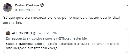 “Sé que quiere un mexicano sí o sí por lo menos uno, aunque lo ideal serían dos”, informó el ex jefe de comunicación del equipo cementero, ante los cuestionamientos de la afición y los movimientos que todavía podría hacer La Máquina antes de su debut en el Clausura 2024.