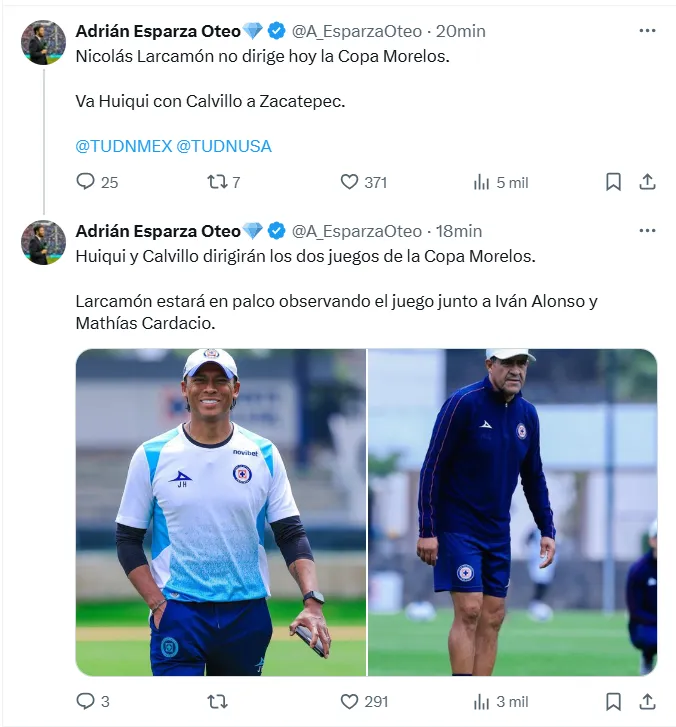 La noticia fue confirmada por el periodista Adrián Esparza Oteo, quien reveló que Larcamón no estará presente en el área técnica durante el torneo, sino que observaría el juego desde un palco acompañado por Iván Alonso y Mathías Cardacio. En su lugar, Joel Huiqui y Marco Calvillo serán los encargados de dirigir a los jóvenes cementeros en los dos encuentros del cuadrangular.