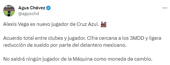 “Alexis Vega es nuevo jugador de Cruz Azul. Acuerdo total entre clubes y jugador. Cifra cercana a los 3MDD y ligera reducción de sueldo por parte del delantero mexicano. No saldrá ningún jugador de la Máquina como moneda de cambio”, informó el periodista, a través de su cuenta de Twitter.