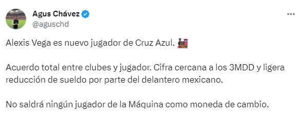La misma fuente añadió que la transacción estaría por concretarse luego de que Cruz Azul aceptara pagar alrededor de 3 millones de dólares por la carta de Alexis Vega. Además, dio a conocer que el propio jugador nacido en la Ciudad de México habría aceptado una reducción de suelo para poder arribar a La Noria.