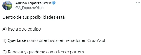 Asimismo, el comunicador de TUDN ratificó las tres opciones que baraja Chuy Corona en estos momentos: “Irse a otro equipo, quedarse como directivo o entrenador en Cruz Azul, o Renovar y quedarse como tercer portero”. Todo está por verse…