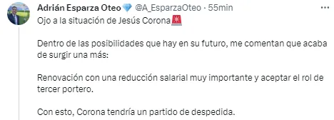 “Ojo a la situación de Jesús Corona. Dentro de las posibilidades que hay en su futuro, me comentan que acaba de surgir una más: Renovación con una reducción salarial muy importante y aceptar el rol de tercer portero. Con esto, Corona tendría un partido de despedida”, escribió el reportero a través de su Twitter.