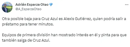 De acuerdo con información del periodista de TUDN, Adrián Esparza, Guty se uniría a la lista de bajas de Cruz Azul de cara al Apertura 2023, pues la directiva celeste volvería a darle salida a préstamo, con el objetivo de que pueda tener registrar más tiempo de juego.