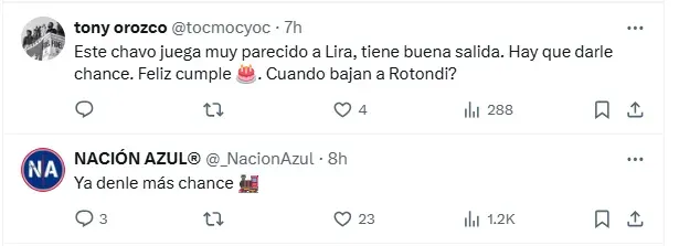Si bien Cruz Azul le honró con un mensaje en redes sociales, desde la afición reaccionaron pidiendo más minutos para el joven mediocampista de cara al próximo torneo. “Este chavo juega muy parecido a Lira, tiene buena salida. Hay que darle chance.”, fue una de las reacciones más compartidas en la publicación.