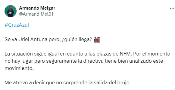 De esta manera, la gran preocupación apunta al reemplazo de Uriel Antuna en Cruz Azul. Y aunque, la realidad es que luce complicado un fichaje a estas alturas del mercado, aunado a que el equipo celeste no cuenta con plazas de extranjero, el sustituto ideal estaría en la cantera.