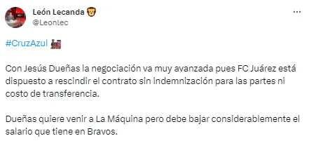 “Con Jesús Dueñas la negociación va muy avanzada, pues FC Juárez está dispuesto a rescindir el contrato sin indemnización para las partes ni costo de transferencia. Dueñas quiere venir a La Máquina, pero debe bajar considerablemente el salario que tiene en Bravos”, explicó el reconocido periodista.