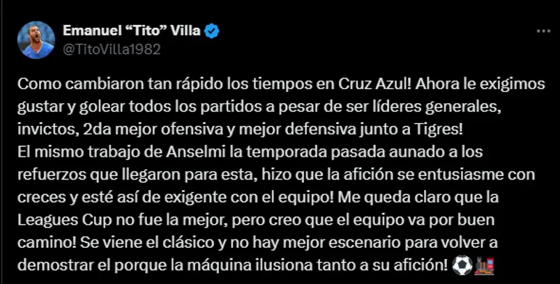 Sobre esto habló Emanuel Villa en su cuenta oficial de X, levantando la voz ante los constantes reproches. Con un largo texto, el ex delantero empezó: “Como cambiaron tan rápido los tiempos en Cruz Azul! Ahora le exigimos gustar y golear todos los partidos a pesar de ser líderes generales, invictos, 2da mejor ofensiva y mejor defensiva junto a Tigres!”.