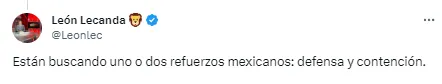 La buena noticia para la afición cementera, después del desastroso debut en el Clausura 2024, es que Cruz Azul sí estaría buscando dos refuerzos más en este mercado. De acuerdo con información del periodista de ESPN, León Lecanda, sigue activa la búsqueda en el mercado nacional.