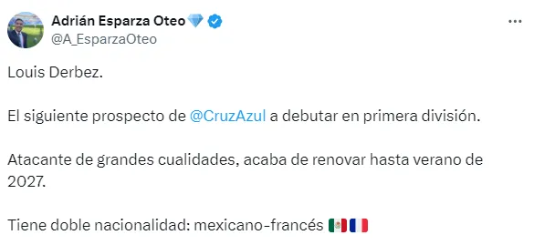 “Louis Derbez. El siguiente prospecto de Cruz Azul a debutar en primera división. Atacante de grandes cualidades, acaba de renovar hasta verano de 2027. Tiene doble nacionalidad: mexicano-francés”, escribió la misma fuente, a través de su cuenta de Twitter.