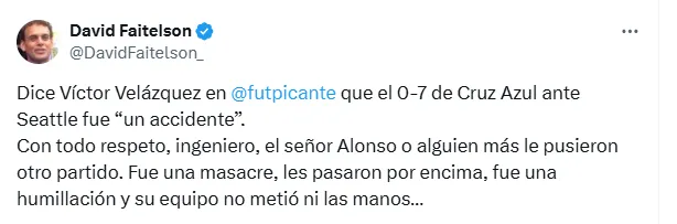 Sus declaraciones no pasaron desapercibidas. Uno de los primeros en reaccionar fue el periodista David Faitelson, quien fue tajante en su cuenta de X con un mensaje que ironizaba la postura del directivo: “Con todo respeto, ingeniero, le pusieron otro partido. Fue una masacre, fue una humillación y su equipo no metió ni las manos…”.