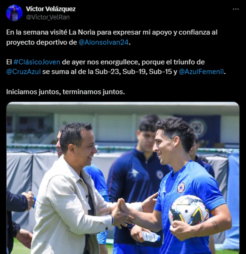 En un interesante ida y vuelta, el ex delantero también habló vía X: “Muchas Gracias por su respaldo Presidente Víctor Velázquez. Estoy muy orgulloso de pertenecer a la familia Cruz Azul. El esfuerzo y compromiso de los jugadores, CT y trabajadores del área deportiva y administrativa nos ha traído hasta acá. Seguimos juntos y vamos por más!!”, sentenció.