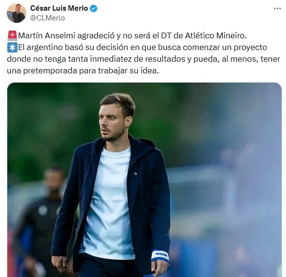 Cuando parecía que Anselmi iba a tomar el reto de Mineiro, todo indica que no va a ser el entrenador del Galo. Así lo informó César Luis Merlo:“Agradeció y no será el DT de Atlético Mineiro. El argentino basó su decisión en que busca comenzar un proyecto donde no tenga tanta inmediatez de resultados y pueda, al menos, tener una pretemporada para trabajar su idea”.