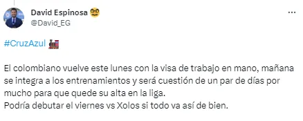 “El colombiano vuelve este lunes con la visa de trabajo en mano, mañana se integra a los entrenamientos y será cuestión de un par de días por mucho para que quede su alta en la liga. Podría debutar el viernes vs. Xolos si todo va así de bien”, escribió el periodista.