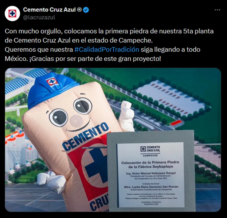 “Con mucho orgullo, colocamos la primera piedra de nuestra 5ta planta de Cemento Cruz Azul en el estado de Campeche. Queremos que nuestra Calidad Por Tradición siga llegando a todo México. ¡Gracias por ser parte de este gran proyecto!”, se lee en el anuncio por redes sociales.
