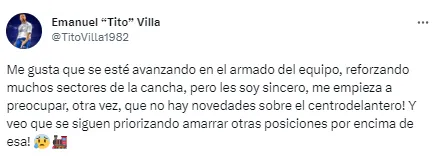 “Me gusta que se esté avanzando en el armado del equipo, reforzando muchos sectores de la cancha, pero les soy sincero, me empieza a preocupar, otra vez, que no hay novedades sobre el centrodelantero. Y veo que se siguen priorizando amarrar otras posiciones por encima de esa”, externó Emanuel Tito Villa, uno de los últimos campeones de goleo con Cruz Azul.