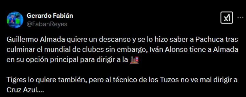 La información surgió a partir del periodista Fabián Reyes, quien en su cuenta personal de X dio detalles al respecto. “Guillermo Almada quiere un descanso y se lo hizo saber a Pachuca tras culminar el mundial de clubes. Sin embargo, Iván Alonso tiene a Almada en su opción principal para dirigir a la Máquina”.