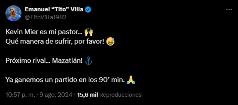 Justamente de ello habló Emanuel Villa, quien en su ya no tan nuevo rol de periodista opinó en las redes sociales cómo vivió las cosas. Concretamente en su cuenta personal de X, el ex goleador le agradeció al portero colombiano de un modo un tanto gracioso: “Kevin Mier es mi pastor…”, con un emoji de manos rezando.