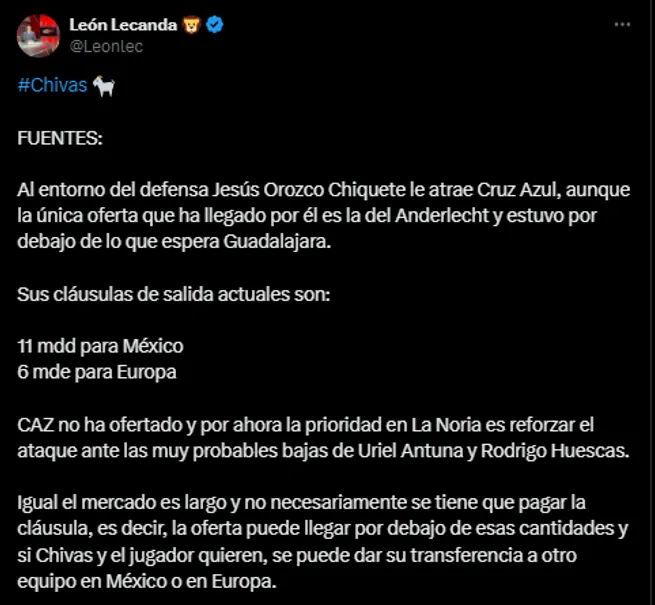Además, Chiquete Orozco fue sondeado por varios equipos de Europa, pero la propuesta del Anderlecht de Bélgica de 6.5 millones de dólares ha sido la única en llegar a las oficinas del Rebaño. Sin embargo, la misma no habría convencido a la directiva de Chivas, dejando en bandeja la oportunidad para La Máquina.